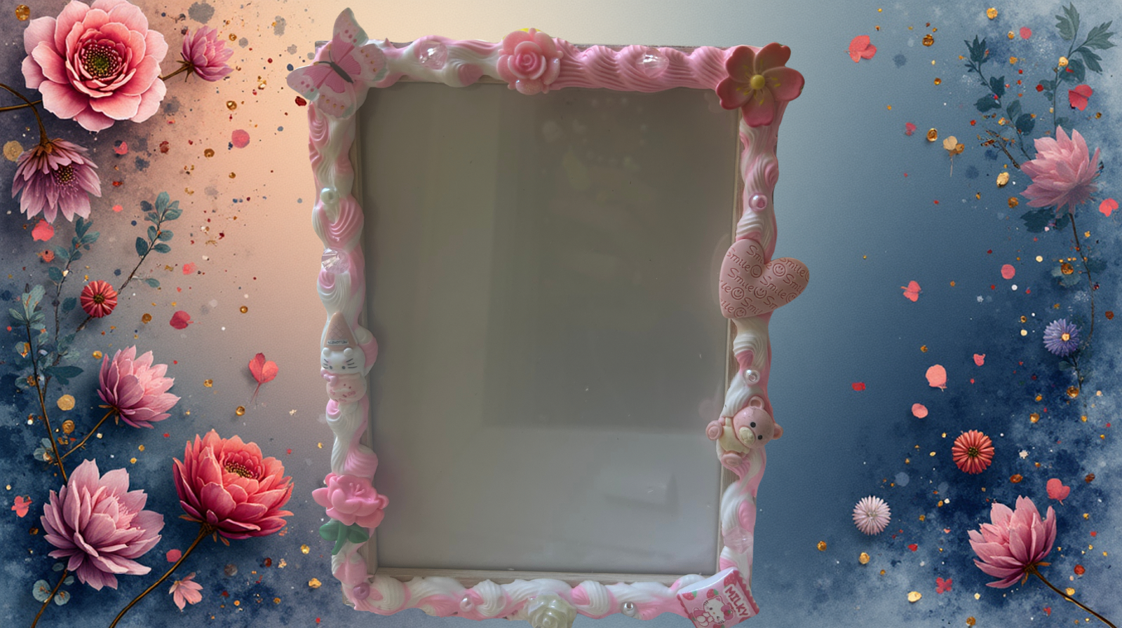 Cadre aux teintes roses et blanches, offrant une allure féminine rehaussée par ses charms décoratifs et une délicate touche florale.